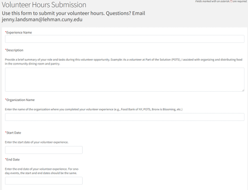 For any clarification or additional information about eligible volunteer hours, please reach out to Jenny Landsman at jenny.landsman@lehman.cuny.edu.