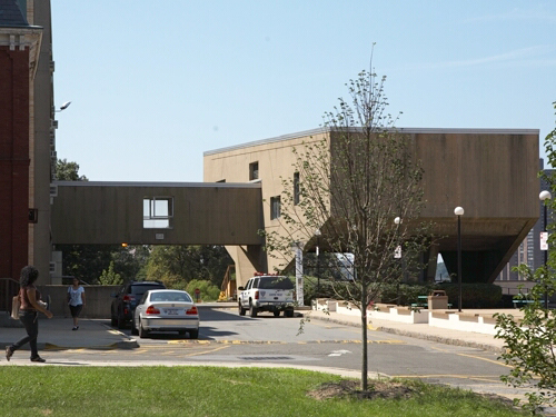 Breuer’s abrupt, functional linkages of unrelated sizes and shapes are an exciting alternative to the formality of Stanford White. But it must be admitted that alongside the elegance and finish of the original buildings, Breuer’s seem disappointingly crude. Strip windows and a yellow brick veneer do nothing to enliven boxy Gould Hall, and Breuer’s signature entrance canopy—a flared concrete scoop which undergraduates call “the potato chip”— is out of contention with the library’s glorious Roman porch (with which it is feistily aligned).
