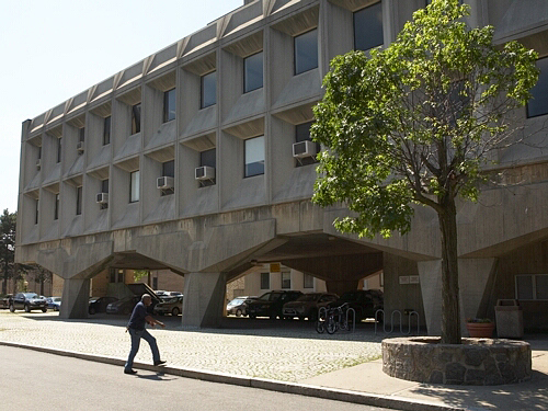 The one exception is tiny Begrisch Hall. This is an outstanding example of “brutalist” architecture, named for “beton brut,” the French term for concrete with an unfinished surface. Breuer has left the marks made by his forms—lumber used as temporary molds—on the faces of his all-concrete building, in some places running in different directions and sectioned like a patchwork quilt. But Begrisch is “brutal” in other senses too, a squat volume which slopes downward from each end, balancing at the center on short splayed legs and a box-like entrance which leads up into its belly from below. It is a weird piece of abstract sculpture—a biomorph, in distinction to the geometrical abstractions which surround it—and at the same time a strictly functional enclosure for two back-to-back auditoriums with raked floors, based distantly on a famous Moscow meeting hall designed by the Soviet architect Melnikov.