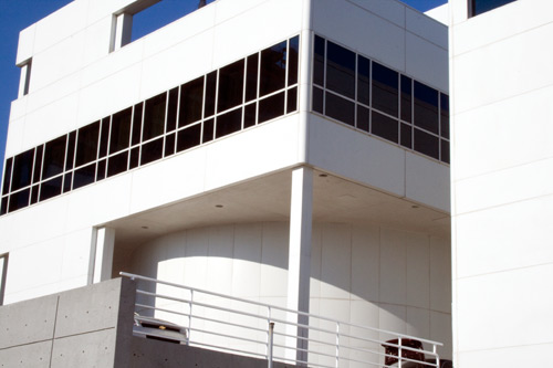 In quest of floor space, the current Bronx developer has made Meier’s three buildings into one, and added a curved entrance near the base of the U. He’s kept some of the features along the inside courtyards, including Meier’s Corbusier-inspired white pipe railings and enclosed flying walkways. But on the parkway side, he has eliminated the four delicate “houses,” filling in their intervals and joining their facades into a tinted-glass and white aluminum wall. (He hasn’t been able to eliminate their interesting undulation: Meier’s separated residences had been progressively stepped, and from a car passing southbound on the parkway they seemed to push amiably forward.)