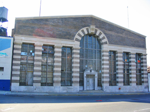 Light for the interior and access for hauling are provided by a classical partition of the building’s front and rear facades. On Bruckner Boulevard, bays holding two-story vertical windows stand on each side of a high arched window, the width of two bays, into which an ornamented metal doorframe is set. The attic above is surprisingly perfunctory, a stretch of bare brick rising to a pediment with a thin limestone coping. On the building’s other side the rhythm is reversed, four double-width bays open to trucking flanked by two single bays.