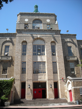 The new Clinton was finished in 1929, just before the arrival of the Depression trimmed many of these projects. Its predecessor, the 1905 work of architect C.B.J. Snyder, is located at 58th Street and Tenth Avenue in Manhattan, where as Haaren Hall it today forms part of John Jay College (CUNY). Built to house 3,500, the striking Flemish Renaissance building had already been outgrown by 1917, when the Board of Education acquired 45 acres of the reservoir site. Plans for the Bronx Clinton were not drawn up until the mid-twenties, by which time Snyder had been replaced as Superintendent of School Building by William H. Gompert. A prodigious builder—he put up one hundred and seventy new schools in his brief five-year tenure—Gompert enjoyed the advantages of frequently designing schools for the outer boroughs. Snyder’s Clinton, for instance, had required an innovative H-plan to shoehorn five stories of classrooms, auditorium, and gymnasium into a narrow midtown block. Gompert’s Clinton, on the other hand, has been allowed to sprawl over its generous site. The three-story main building has a hollow rectangular plan. Its long side, facing Mosholu Parkway, is bisected by an axis that passes from the towered entrance, through the large auditorium in the middle of the interior courtyard, and out along corridors to a gymnasium to the south. Because the main building stands at the brink of the old excavation, Gompert was able to fix the base of the auxiliary building two stories below street level, where it opens onto athletic fields reached by terraces and stairs from the campus above. As a result, the bulky gym doesn’t break Clinton’s low profile, and leaves its outstanding architectural feature, an immense tower-lantern with pyramidal roof and attenuated cupola, in eye-catching isolation.