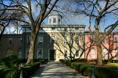 Another, smaller building at Rose Hill, now the Alumni House, looks rather like the “pill box” it was named by students when it served as the college’s infirmary. But still there are emphatic ornamental touches: sidelights and pilasters at the doorway, a wood attic story under a cornice, keyed lintels, and a flight of steps with an iron balustrade. Bearing the date of 1840 over its door, this may nevertheless be an outbuilding of the original estate fitted out to house students or faculty while the new seminary building was being prepared.