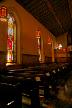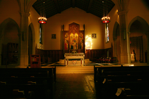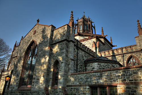 Adjoining the hall, Roderigue built a small chapel for the seminarians. St. John’s (now University Church) carries over the surface details of its neighbor, using the same brown stone on its stringcourses, hood-moldings, and enframements, as well as on the finials along its nave roof. (That roof has a crenellated parapet, matching the one on the hall.) The main feature of the original church is its frontal square-plan tower, in English Decorated style. The pointed-arch of the entry is repeated in a quoined window-frame above, with an oculus in the third story, where presumably first hung the bell which disturbed the sleep and inspired the poetry of Edgar Allan Poe, who lived a short distance away.