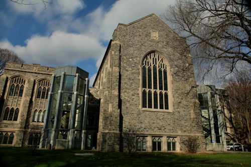 That building, St. John’s Hall (1845), is where architect Roderigue tried his hand at the Gothic Revival style. Like its “Greek” predecessor, early Victorian Gothic was often a matter of picturesque detail rather than fundamental structure. The seminary building is a three-story rectangular box to which medieval accessories have been applied--but with extreme delicacy. Buttresses rising to turrets divide the facade into seven bays. The irregularly coursed rough ashlar of the walls contrasts with a smooth brown stone that organizes the horizontals of the facade, the brown capstones of the buttresses being placed at the levels of the brown window label-moldings, for example. From the same attractive stone are carved the cusped enframements of paired diamond-pane windows, as well as the central ogival doorway. The original hall is beautifully preserved, and even after having been joined (in 1940) by two other buildings in a closely imitative style, maintains its uniqueness in the resultant Queen’s Court.