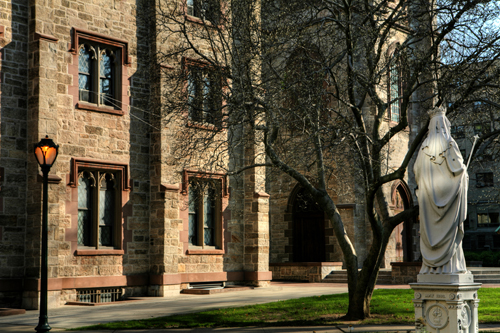 Hughes’s brother-in-law, William Roderigue, served St. John’s as lay instructor in mathematics and engineering. Roderigue, by profession an architect, would a decade later be assisting James Renwick Jr. in the neo-medieval design of New York’s St. Patrick’s Cathedral. In the 1840s, he was faced with the task of converting a Greek Revival campus to an appropriately Gothic style.