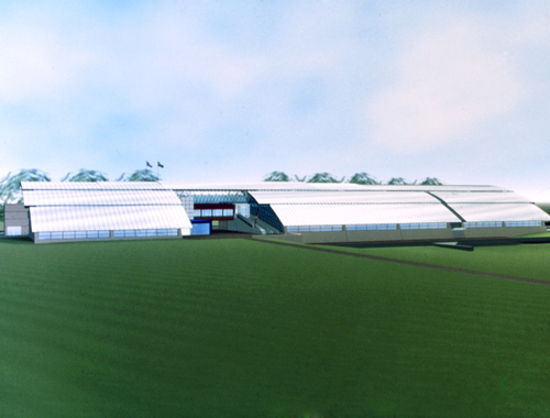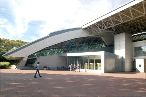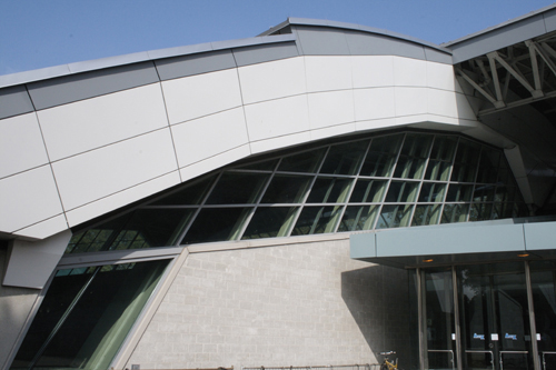 Although two large basins were excavated for the Jerome Park Reservoir, the one to the east of today’s Goulden Avenue was found to be unnecessary, and in 1912 was refilled with earth. A number of municipal facilities which have since been built on the site have taken advantage of the prepared ground, utilizing areas below street level such as Kingsbridge Armory’s vast subterranean garage and Lehman College’s bi-level campus center. In designing his 1994 APEX sports complex for the college, Rafael Viñoly was similarly led to sink the large interior spaces—a basketball arena, a hall for the Olympic pool, and a gymnasium with running track—almost entirely below grade. As a result, instead of having to enclose APEX in four walls, he has been able to rest the vast convex roof—or at least its leading edge—almost directly on the ground.