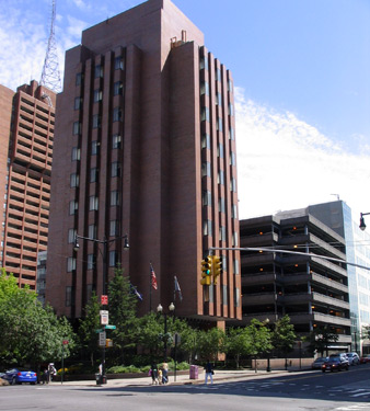 The eleven-storey brown brick tower has the plan of a Greek cross, built outward in four stages. A square core is held at its corners by wide piers, which rise to almost the full height of the building. Between the piers on each side protrudes a nine-storey rectangular block, its base overhanging the entrance and lobby, its top stopping short of the piers’ tops, producing at the summit a series of setbacks like those of a classic skyscraper. On the face of each extruded block is a bank of five raised vertical ribs, with narrow, shadow-laden valleys between them. Three of these carry window-bays; the other two are blind brick. (The thin and long glazed bricks used show Johnson’s continued preference for elegant materials.)