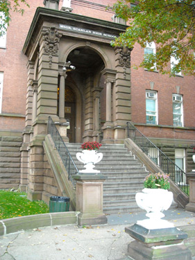 It was Msgr. Arthur J. Scanlan, pastor of the Parish of St. Helena, who founded these high schools. This Catholic parish is one of two serving the Parkchester community. Among a handful of remaining Catholic-parish high schools in the Bronx today, Scanlan High School is on property formerly owned by another Catholic institution—St. Joseph’s School for the Deaf (now on the other side of Hutchinson River Parkway). With the cutting through of the Hutchinson River Parkway in 1939, St. Joseph’s property was bisected. A tunnel with tracks (now closed) ran under the highway and connected the two sections of St. Joseph’s. The impracticality of maintaining the St. Joseph’s School on two sides of the highway, however, eventually led to the conversion of this site for St. Helena’s high schools.