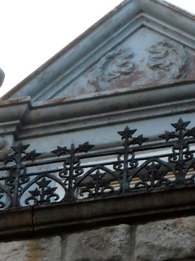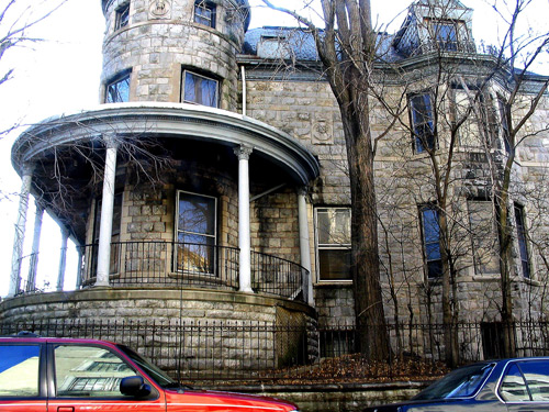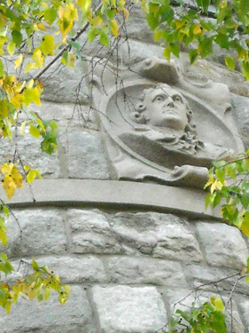 Its style is derived from French Renaissance chateaux, with cylindrical towers topped by “candle-snuffer” conical roofs standing at either corner of the Anthony Avenue facade. Stairs from the street reach a raised veranda and the central doorway, where stone caryatids, representing classical deities, support a florid carved entablature with dolphin-shaped consoles and a Pan-faced keystone. Thin columns carry the porch to the right around the larger tower and onto the Mount Hope Place side of the house, where carving appears again in two portrait roundels. (A woman’s face is set between the tower’s upper windows, a man’s—apparently, Shakespeare’s—lower down along the side.) The walls of the house are built in alternating courses of large and small rough-faced stone blocks, joined with red mortar.