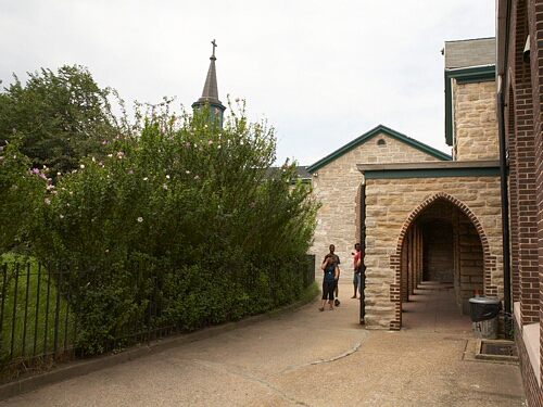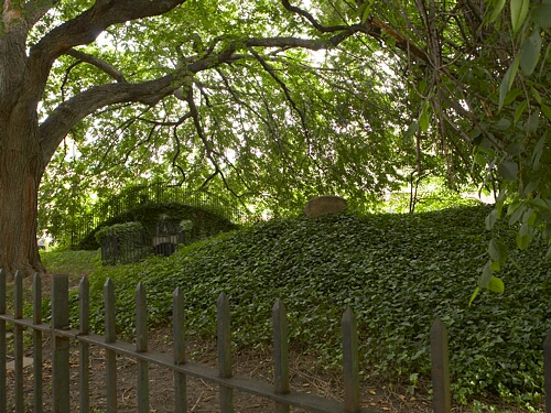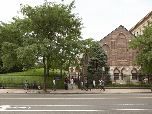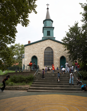 This simple and rough-hewn building, the oldest existing church in the Bronx, stands well back from St. Ann’s Avenue, its low roof following the crest of a green hillside in a shred of park enclosed by tenements. The Landmarks Preservation Commission characteristically describes the setting as “ a forgotten ‘country churchyard’ in the heart of the sprawling city.”