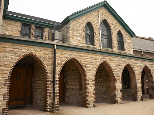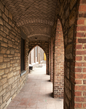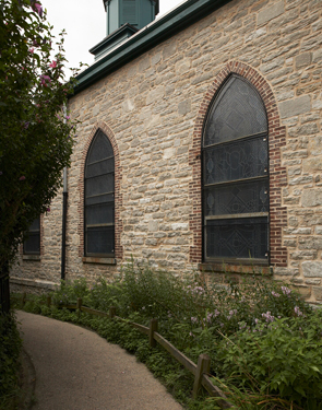 Made of randomly coursed fieldstone, St. Ann’s has the plan of a Latin cross, with a single-story, pitched-roof nave and cross-gabled transept. Six windows punctuate the nave walls with larger stained glass reserved for the transept ends and the south entry. The brick-framed openings have pointed arches, a gesture to the Gothic revival that is answered by a more sustained bow to the Georgian style in the details of the tower—a cube surmounted by an octagonal belfry, both with pilasters and cornices, and a stubby steeple. St. Ann’s has no portico, however, but only a wide flight of steps rising to two arched doorways. At the north end, connecting to the original apse, is a more recent parish house, used today for an active community program, from which an arcade leads to downhill steps. In an iron-fenced plot to the southeast of the church entrance are low, grass-covered mounds, family vaults of the Morris family, contributing to the primordial air of the church and site.