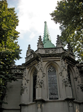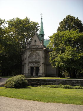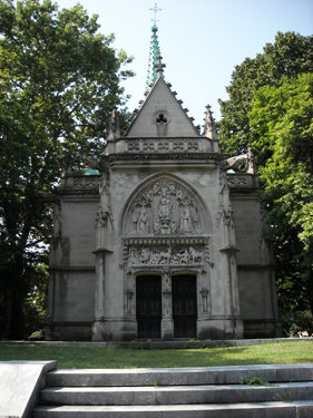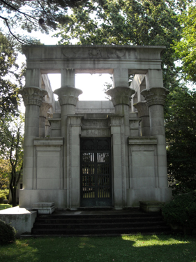 Eclectic profusion is most extreme in the mausoleums of the Gilded Age. Beginning in the 1880’s, New York’s mercantile and financial plutocracy experienced something like a collective mania for building “historical” residences, which spilled over from the pocket palaces and castles of upper Fifth Avenue and the sprawling mansions of Newport onto the gravesites of the Bronx. Sophisticated, often Europe-trained American architects were hired to build tombs which accurately imitated the temples or vaults their patrons had learned to admire on Continental tours. The result is that Woodlawn today is a veritable museum of architecture.