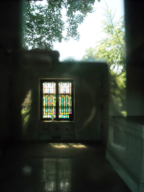 What’s missing in these and most of Woodlawn’s historical re-creations is some felt connection between the architecture and the life it commemorates. To find a building whose reference to the past imaginatively expands into the present and personal, we can turn to the memorial John Gamble Rogers has created for the Straus family, owners of Macy’s department store and New York political figures. On three sides of a flagstone courtyard planted with trees stand identical, strangely characterless tombs. These are single-story, blank rectangular blocks, facing the yard with plain walls of coarse-grained grey-brown ashlar, each with a central door. Their only ornaments are metalwork grilles, in different leaf forms, over the portals. On the yard’s fourth side, between two metal fences, is a low box of the same stone, serving as pedestal for an enigmatic object: the bluntly-carved, modernistic representation of an ancient oared galley with a hooded deck.