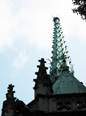 The fifteenth-century original, perched high on a castle wall overlooking the river valley, has drawn tourists since its restoration in the mid-nineteenth-century. But cemetery visitors, who can walk completely around the Belmont tomb, get a much better view of its sharp geometry and vigorous carved detail. What they see is a miniature Gothic church (42.5 by 34 feet) in the form of a Latin cross, with a semicircular apse at one end, and at the other a porch bearing a sculpted stone lintel and tympanum. The profile of the grey limestone chapel is, in the “Flamboyant” manner, wonderfully spiky. A thin pointed spire (or flèche) stands at the crossing of the steeply-pitched roofs, and finials sprout at each corner of the parapet, with long-necked gargoyles stretching out horizontally below.