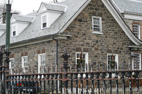 The Van Cortlandt Mansion’s nine rooms have been completely restored and feature period furnishings and 18th and 19th century Dutch, English and American decorative objects. The interior of the 2-1/2-story L-shaped house is notable for its rich décor, fine wood paneling, fireplaces, and Dutch tiles. The house is meant to show the lifestyle of a prominent and prosperous Dutch-English family in the second half of the eighteenth century. The exterior of the house is constructed of dressed fieldstone with red brick trim around the windows. Carved faces, known as gorbels, serve as window keystones. They were a typical early design feature used in Holland around the time of construction. The upper windows of the house have seven dormers in all. A front stoop is another Dutch feature. Robert Moses demolished the formal Dutch garden and steps just south of the mansion, in the early 1970s for construction of the swimming pool just to its west.