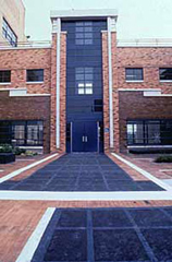 Acconci has created a courtyard design which transposes elements of the building's façade onto the ground of the plaza. The courtyard spaces are enclosed by a classroom building on one side, a cafeteria / gymnasium on the opposite side, and a connecting bridge building in the middle. Stamped cement pavers imitate the brick of the building walls. Seating and planters are modeled after the panes and mullions of the windows. Constructed in black concrete with sparkling bits of mica, some elements are raised and serve as benches. Mirrored sides make these windows appear to float. Others are flush with the ground. The proposal drawing is an Escher-like rendering of the site. The project continues Acconci's interest in transposing and subverting the logic of architectural space.