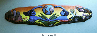 Andrea Arroyo, known for her relief paintings with lyrical figures that seem lighter than air, has created two large-scale reliefs for I.S. 206. Located about thirteen feet above the passageway, they are cast in fiberglass and painted. In Harmony I , blue, purple, and green dreaming figures with closed eyes provide a reference to the racial diversity of the school. The figures are surrounded by symbols of knowledge: the keys to understanding and harmony between all people. The mural contains references to architecture, history, chemistry, math, painting, and music.The second relief, Harmony II, symbolizes the harmony between nature and the city and depicts elements of each. Two figures, male and female, embrace the globe.