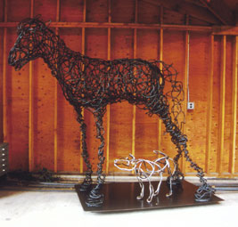 Monica Banks created two large steel sculptures for the Hunts Point Recreation Center: Louisa, a horse located outside the basketball court, and Rusty, a dog located in the lobby near the front desk. Both sculptures were forged from continuous steel rods and each resembles a three-dimensional line drawing. The artist explained that by installing these "functionless" sculptures at a recreation center, she hoped to inspire children's interest in creating and admiring works of art.