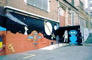 One of the largest murals in New York City, Living on Mars stretches over 7,000 square feet and depicts the hope-filled dreams and aspirations of students at C.E.S. 64. Images of fantastic alien life-forms, robots, human explorers, and spacecrafts dance across a myriad of brightly-colored landscapes that is both space and the fields of the imagination. The work was a cooperative effort between the artists and about 150 students involved in the project.
