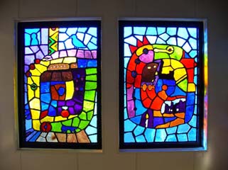 This series of faceted glass windscreens and windows captures the essence of moments experienced by the artist, Dina Bursztyn, as she traveled the elevated tracks in the Bronx. As commuters wait on the platform at 170th Street, they are reminded by the glass images that surround them of the magical ride on the “El” train. Travelers can overlook small neighborhoods and see birds at eye-level. Bursztyn brings new meaning to familiar locations by sharing her memories. She explains, “The time is sunrise or sunset. The sky unfolds in brilliant colors—the train seems to be riding among clouds, everything is coated with a glowing halo….”