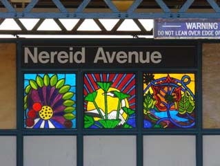 The artist, Noel Copeland, has designed this glasswork to celebrate the abundance of flora and fauna in the Bronx and to honor the parks and gardens within the area, such as the Bronx Botanical Garden, the Bissel Gardens, local community gardens, and the Bronx Zoo. These radiant faceted glass panels recreate the organic forms and structure found in nature, transforming the station for travelers arriving at and departing from this urban area.
