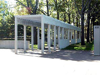 Jackie Ferrara's 107-foot concrete block pergola, Covered Walkway, is located on Lehman's College Walk, a tree-lined corridor, and extends onto the gym plaza. The walkway provides an entry portal from the street through the gym, and onto the campus proper. The design explores the architectural space of a passageway. As it is entered and traversed, Covered Walkway claims "time" as an element. Its rhythmically-spaced slates create fluttering patterns of light and shadow, and frame views of the campus. The walls are punctuated by intervals of penetrated space which increase in frequency as the wall evolves into columns. Overhead the spacing of the bars increases, allowing views of the trees. It is the experience of moving through the space that is central to the artist's intent "where the viewer becomes part of the piece rather than seeing it as an object." The site design was developed in close collaboration with the architect, Rafael Viñoly.