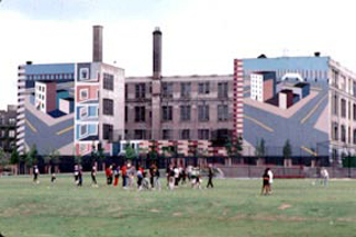 Anne Finkelstein's mural Line of Sight embraces two large walls of the building linked together by a lower middle wall. This unusual format sets the stage for a mural depicting architectural elements and scenes from the South Bronx in a simplified yet recognizable way. Finkelstein matches the geometry of the urban city structure to the geometry of the building, linking the concepts of a smaller unit to the concept of a larger, much wider setting. Finkelstein conveys the geometry of urban life in the city to the structure of the existing building in a painterly and metaphorical way. The city is depicted as a landscape with empty streets and vacant buildings and rooms. It is in sharp contrast to the vibrant activity of the neighborhood.