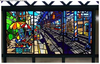 The faceted glass windscreens at the Freeman Street Station depict a scene of a Bronx street that lies beneath the immense structure of the “El.” The artist, Daniel Hauben, is a Bronx resident who is inspired by the unique character of the borough.