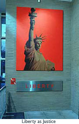 Vitaly Komar and Alexander Melamid's two paintings for the Housing Court, Liberty as Justice and Justice, blend the iconography of the Statue of Liberty with the allegorical figure of Justice. These allegorical works have their source in the New York State seal which includes a globe and eagle flanked by the figures of Liberty and Justice. The artists, known for their use of social realism as a vehicle for conceptual irony, see this work in the tradition of Jasper John's Flags and Andy Warhol's Maos and Hammers and Sickles.