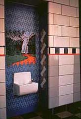 Justen Ladda's project at P.S. 7 touches all aspects of design and spans two floors at P.S. 7. It includes the color scheme for tiles in the halls, bathrooms, and stairwell, as well as the mosaic designs surrounding the water fountains and two small sculptures. A delicate painted bronze castle, modeled after the baroque German castle Neuschwanstein which served as the inspiration for the Disney World emblem, is inset in the wall of a corridor. A figure of an astronaut is recessed in a niche in the other corridor wall. Together they provide a reference to a fairy tale past and an icon of the future. Drinking fountain designs based on waterscapes-seaside caves and waterfalls-offer storybook pictures that have been translated into colorful cut stone. The work at P.S. 7 is Justen Ladda's first permanent public project and won the 1992 Art Commission Award for Excellence in Design.