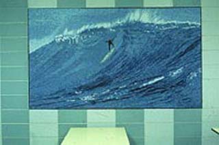 Inspired by Throgs Neck's location on the Long Island Sound, Justen Ladda composed his work around a maritime theme. Like his earlier award-winning work at P.S. 7 in the Bronx, he created an integrated design that includes hallways, staircases, and cafeteria walls and incorporate ceramic tile mosaics. There are three mosaic murals in the cafeteria: an underwater scene of a coral reef, one of a seascape, and yet another of a surfer on a huge wave, as well as a mosaic image of Niagara Falls above a drinking fountain in the hallway. The hallway and stairs are adorned with ornamental Greek key frets in mosaic.