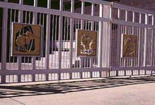 Howard McCalebb has designed four abstract panels set into the plaza gates of the East Academic building. Each four foot by four foot welded steel relief panel contains elliptical shapes surrounded by a network of linear elements and penetrated spaces.