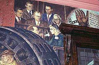 America's varied, dynamic and powerful civilization is depicted on the west wall. Over the center door a quotation from Walt Whitman's With Antecedents stands out against a background of broken chains and a book, the symbol of knowledge and freedom for all. The mural won the gold medal award at the Architectural League's fiftieth annual exhibition.