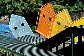 As one approaches the Riverdale Station, four colorful metal sculpture houses jut out of the mass of trees where the station is located. Bright bursts of yellow, orange and blue reach up out of the dense foliage and seem to be ascending and descending in the same way the sun rises and sets.