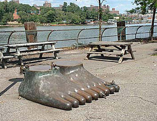 In Roberto Clemente State Park two large feet stand just at the edge of the Harlem River. Surrounded by frolicking Lilliputian figures engaged in a variety of activities, the feet seem to belong to some fallen giant. This cast bronze sculpture with its playful narrative is the work of Tom Otterness whose whimsical inventions depict society.