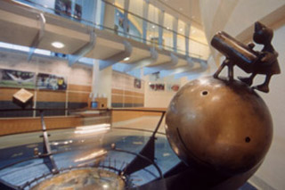 Suspended Mind, a monumental installation in The Carl Sagan Discovery Center in Montefiore Children's Hospital, includes an array of Tom Otterness' signature cartoon-like figures, frolicking on and around a Foucault pendulum. The pendulum, invented by Leon Foucault in 1848, moves with the rotation of the earth. An inverted head with a smiling face gently swings over a map of the world. This whimsical bronze sculpture provides an entertaining focal point as well as a science demonstration.