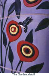 Two colorful columns with terra cotta tiles welcome the students and teachers at P.S. 37. A swirl of flowers and endlessly crawling vines are punctuated with butterflies and birds which appear among the leaves. Butterflies, including cocoons to caterpillars, are shown in different stages to symbolize growth and the natural process. A belief that the discovery of the Americas was the discovery of paradise underlies much of Rodríguez's work. In these columns there is an allusion to the lush beauty of the Americas. Walking through the portal of the two columns, a guitar shape is designed into the granite paving. Its lines are echoed in the curves of the ceiling.