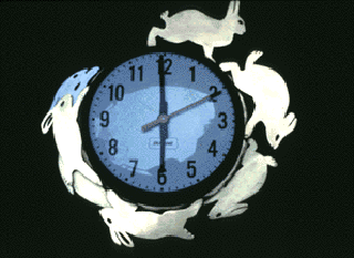 Christy Rupp's sculpture, Time Flies, explores the concept and relativity of time. The work consists of a series of sculptures encircling double-sided hall clocks. Constructed of bronze, brass, copper and aluminum, they include images of animals, such as rabbits, a turtle, a jaguar and an ammonite. Each figure represents a concept of time: for example, the jaguar symbolizes speed while the turtle signifies a slower pace. The animal figures are presented as pairs uniting the concepts of time passing slowly to time passing quickly. One form depicts a turtle with a clock implanted in its shell, while a group of rabbits, at one o' clock, start racing around the perimeter. Another form pairs a comet to an ammonite (a fossil), and a third, a jaguar with a bronze sloth under the frame of a clock.