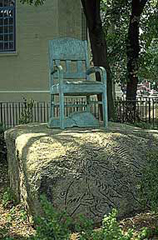 David Saunders' bronze Seat with its bright green patina, provides the focal point for Westchester Square Park / Owen F. Dolan Park, near the train station. It is a place where people wait for buses or rest while shopping. The empty federal style chair, which the artist describes as a seat of honor, recalls the public monuments of an earlier period. A red granite boulder with line drawings of wild boars fighting, frolicking, and feeding their young serves as a pedestal, and alludes to instinctual and emotional aspects of human nature. Under the seat a bronze Merriam Webster Dictionary is open to an entry on the birds of North America, an allusion to the intellectual life. Saunders' project is also about waiting-for the seat to be filled, for the next hero to arrive. It is frequently a place where children play. Saunders' project, sponsored by the Public Art Fund, won a 1986 Award for Excellence in Design from the New York City Art Commission.