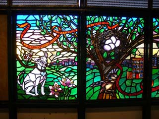 As one waits on the subway platform at 167th street, colorful faceted glass windows line the east walkway. Created by artist Carol Sun, they represent a metaphorical reflection of the Bronx within a heroic time-scape comprised of the past, present and future. The panels combine radiant outdoor urban life with the calm, simple pleasures that are experienced in the home and community.