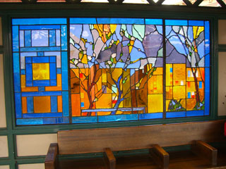 Ukranian-born artist, Marina Tsesarskaya has created these faceted glass panels that represent stylized city views of the Bronx. Each panel represents a season: springtime with blooming flowers and budding trees in front of buildings; summer, a landscape filled with green trees and flowers; fall with falling leaves and darker skies; and winter with snow, and leafless trees. All of the panels contain the same ironwork ornament design that was used in the Prospect Street Station as well as many other Bronx train stations when they were originally constructed.