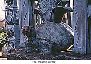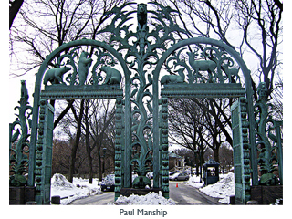 The best known sculpture is not on Astor Court but at the Pelham Parkway entrance, where the Paul J. Rainey Memorial Gateway designed in 1926 by the well-known sculptor Paul Manship was installed in 1934. Made of bronze that over the years has turned a light sea green, the gates are a fantastic structure with two openings surmounted by openwork lunettes and bounded by tree like forms. Around the whole, some 22 different animals, including some former Zoo celebrities—Buster the giant Galapagos tortoise, Jimmy the Shoe bill stork, and Sultan the African lion—are used as decorative motifs.